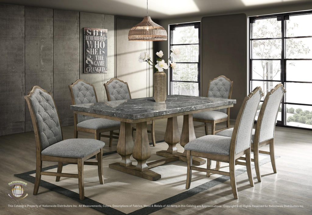 TABLE - D98T TRANSITIONAL STYLE DINING SET IN A LIGHT BROWN FINISH; DOUBLE PEDESTAL BASE SUPPORTS THE REAL MARBLE TOP IN A GREY COLOR; SET FEATURES LARGE AND WIDE CHAIRS IN A LIGHT BROWN TEXTURES FABRIC WITH DEEP BUTTON TUFTING; CHAIRS HAVE SPRING SEAT CUSHIONS TABLE: 42”W x 72”D x 31”H; CHAIRS: 22”W x 19”D x 42”H